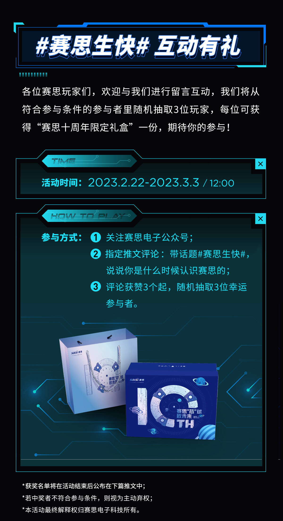 各位赛思玩家们,欢迎与我们进行VX【赛思电子】留言互动,我们将从符合参与条件的参与者里随机抽取3位玩家,美味可获得赛思十周年限定礼盒一份,期待你的参与!